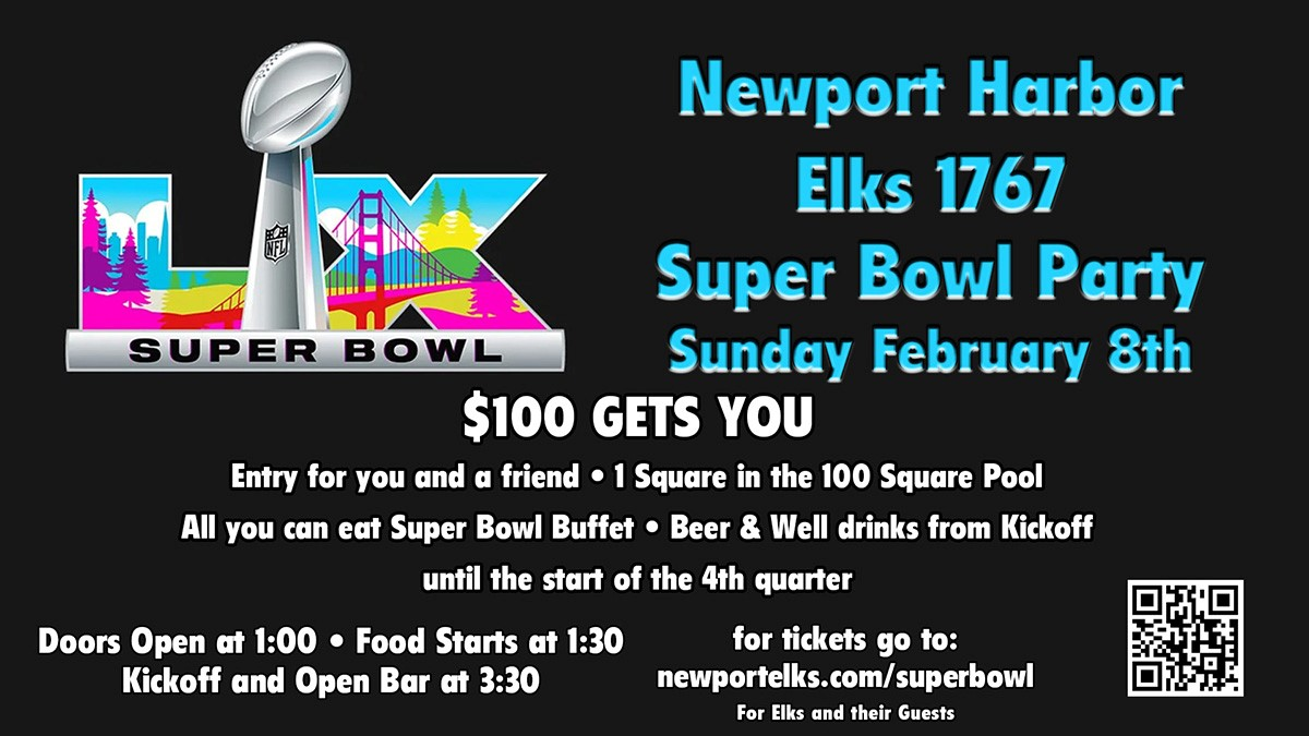 Newport Harbor Elks 1767 Super Bowl Party Sunday, February 8th, 2026 $100 GETS YOU Entry for you and a friend